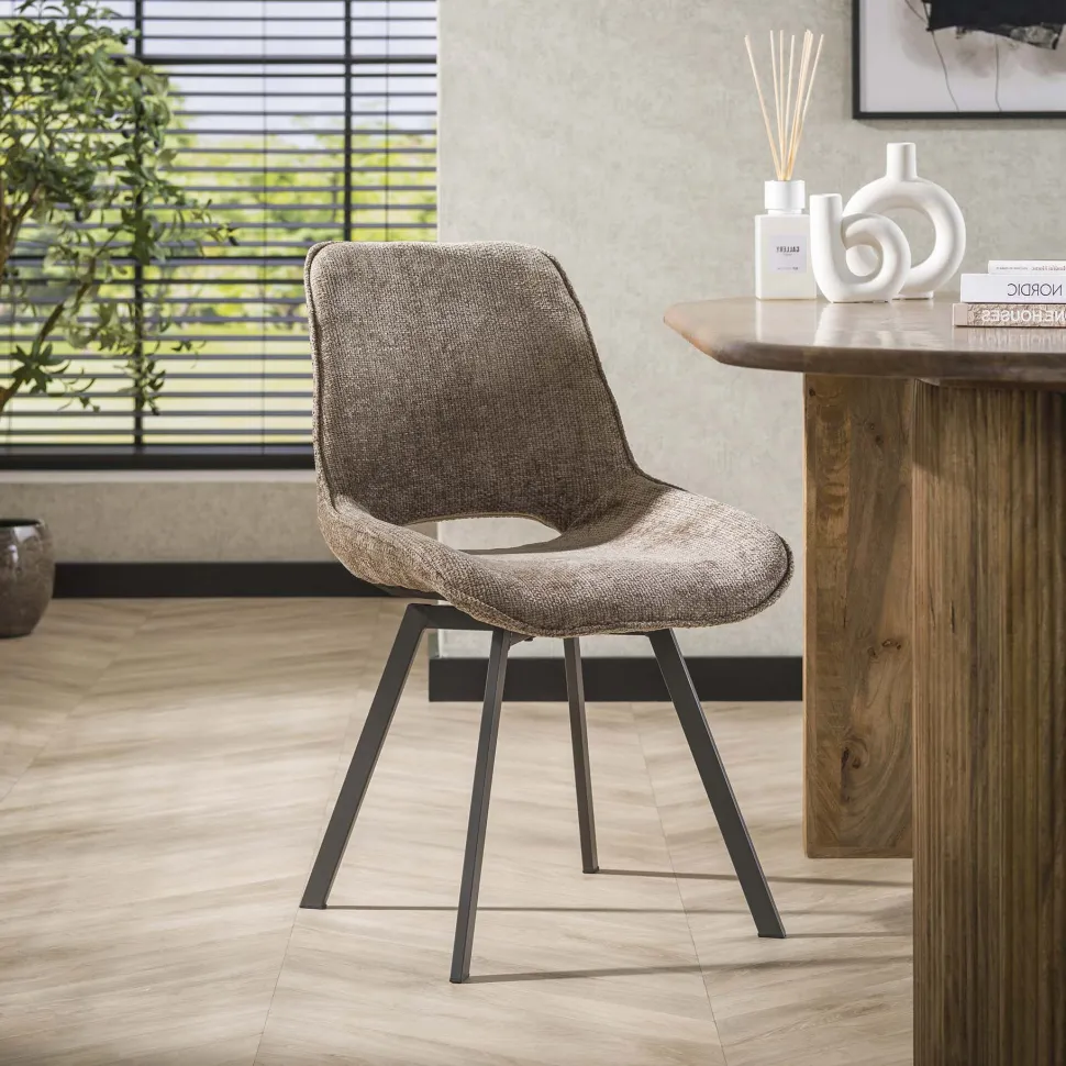 Stoel Swivel is bekleed met een grof geweven chenille stof. De poten zijn gemaakt van gepoedercoat staal in de kleur antraciet. Dankzij de 360° draaibare zitting biedt de Swivel extra gebruiksgemak. Deze stoel is ontworpen zonder armleuningen, waardoor hij gemakkelijk onder elke tafel past. De Swivel eetkamerstoel wordt verpakt per vier stuks, de prijs geldt per stuk.