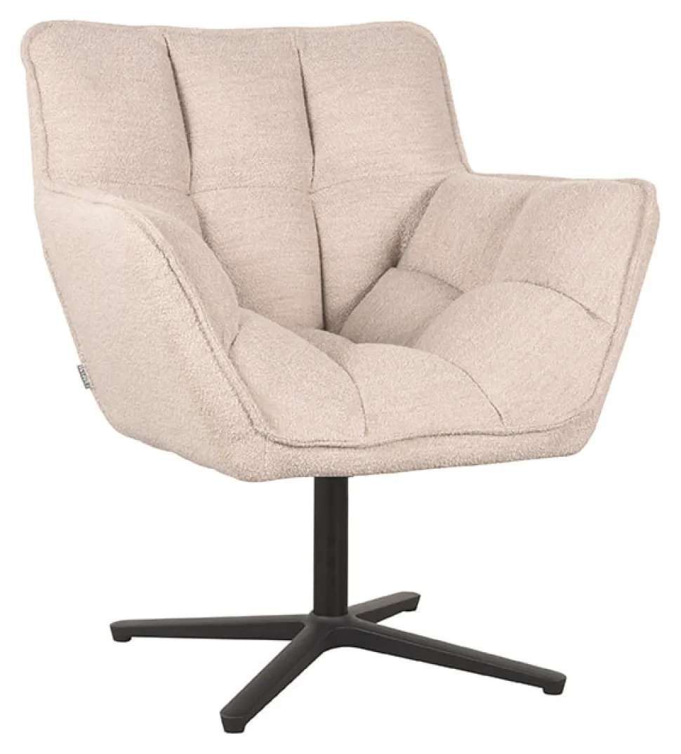 Fauteuil Ian is uitgevoerd in naturel boucle, een zeer duurzame stof, gemaakt van 100% polyester, voorzien van een subtiel contrast en hele fijne structuur. Ian bestaat uit een grote kuip waarbij de zitting doorloopt in de rugleuning en armleuningen. Zowel de voorkant van de rugleuning als de zitting zijn voorzien van een fraai 3D blokstiksel, wat de fauteuil ook nog eens extra comfortabel maakt. De randen zijn afgewerkt met een zeer charmante dubbel gestikte bies. Ian is in het bezit van een kruispoot, uitgevoerd in zwart metaal waardoor de zitting 360 graden draaibaar is. Deze poot zorgt voor extra stabiliteit en een luchtige look.