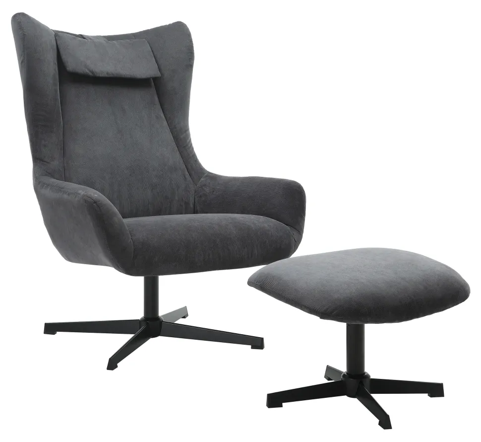 Deze fauteuil en poef set combineert modern design met eersteklas comfort en duurzame materialen. De corduroy stof van de set is niet alleen visueel aantrekkelijk met zijn fijne strepen en subtiele glans, maar ook milieuvriendelijk: het is Oeko-Tex gecertificeerd en PFC-vrij, wat betekent dat het vrij is van schadelijke chemicaliën en op een milieuvriendelijke manier is vervaardigd. De bekleding van polyetherschuim en pocketveren biedt eersteklas zitcomfort en optimale ondersteuning. Of je nu achterover leunt in de fauteuil of je voeten laat rusten op de poef, je zult genieten van het comfort van deze set. De draaifunctie van de fauteuil en hocker maakt flexibel gebruik mogelijk en verhoogt het comfort nog meer. De zwarte poten met poedercoating geven de set een moderne en elegante touch die perfect past bij verschillende interieurstijlen. De gestoffeerde set is de ideale keuze voor iedereen die waarde hecht aan design en functionaliteit en een speciaal tintje aan zijn huis wil geven.