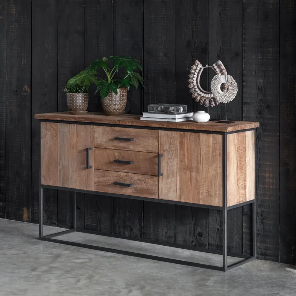 Dressoir Beam is gemaakt van teakhout en is afgewerkt met een metalen frame. Het dressoir heeft een afmeting van 90x158x43 cm en heeft 2 deuren en 3 lades.