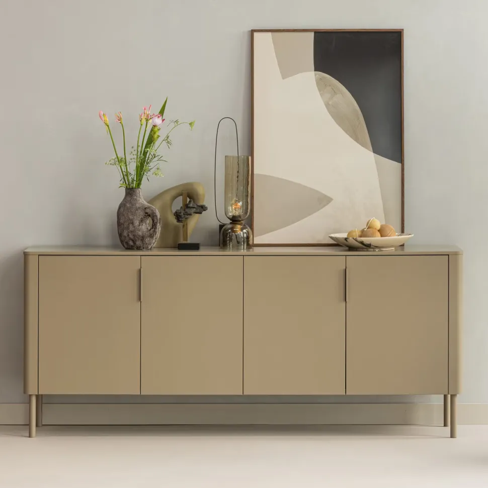 Strak, modern en functioneel. Het Gunnar dressoir van het Nederlandse interieurmerk WOOOD is een stijlvolle opberger met eindeloze mogelijkheden. Dankzij de vier deuren met subtiele greepjes berg je moeiteloos al je spullen uit het zicht, terwijl de rechte lijnen en verfijnde afwerking rust en elegantie uitstralen. Het dressoir is vervaardigd uit massief grenenhout en afgewerkt in een mudkleur. Achter de deuren bevindt zich een royaal opbergvak met een legplank, ideaal voor servies, boeken of woonaccessoires.