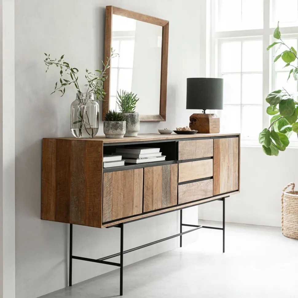 Dressoir Metropole is een combinatie van gerecycled teakhout met metalen pootjes. De Metropole collectie kenmerkt zich door het verjongen van de randen van kastdeurtjes en tafelbladen. Het dressoir heeft 3 deurtjes, 3 lades en 1 open vak. Het dressoir is 95x200x45 cm.