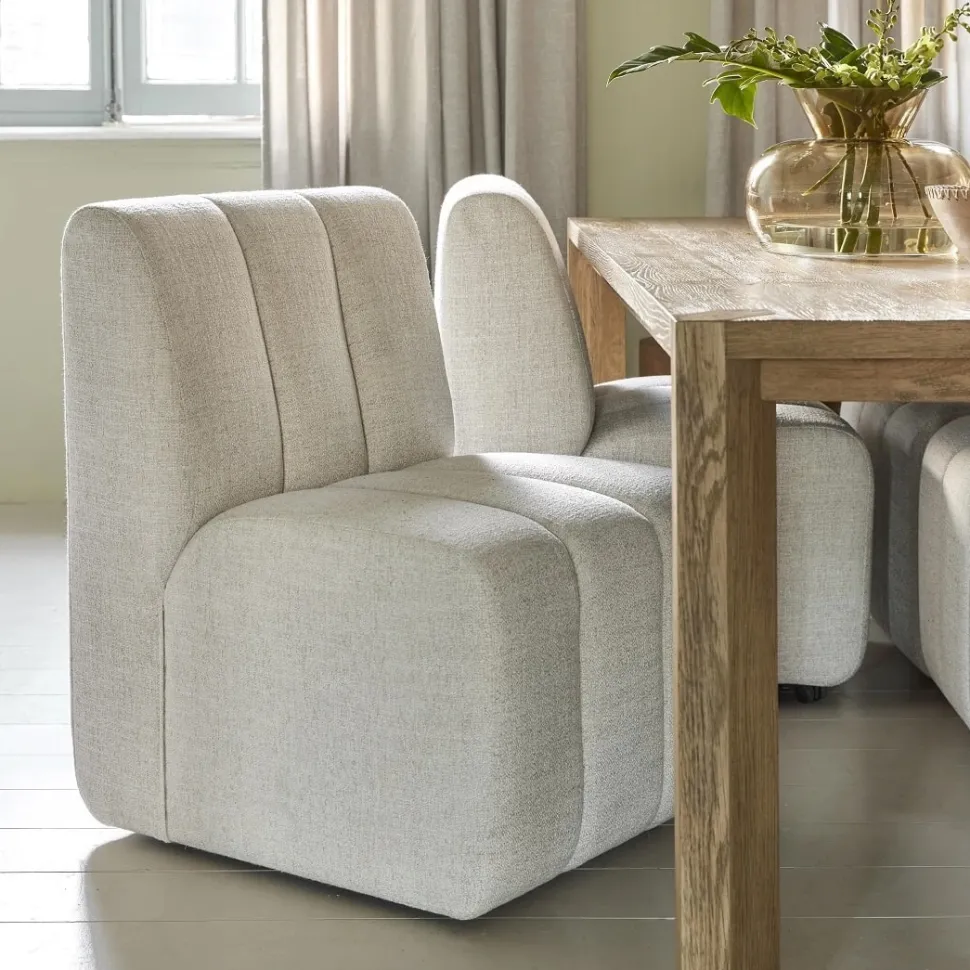 Ontdek de Dazzle Eetkamerstoel verkrijgbaar in meerdere kleuren. Met handige wieltjes aan de onderkant en prachtig vormgegeven banen in het textiel voegt deze stoel niet alleen een vleugje elegantie toe aan je eetkamer, maar biedt hij ook moeiteloze mobiliteit en comfort. Een perfecte aanvulling voor een stijlvolle zitervaring.