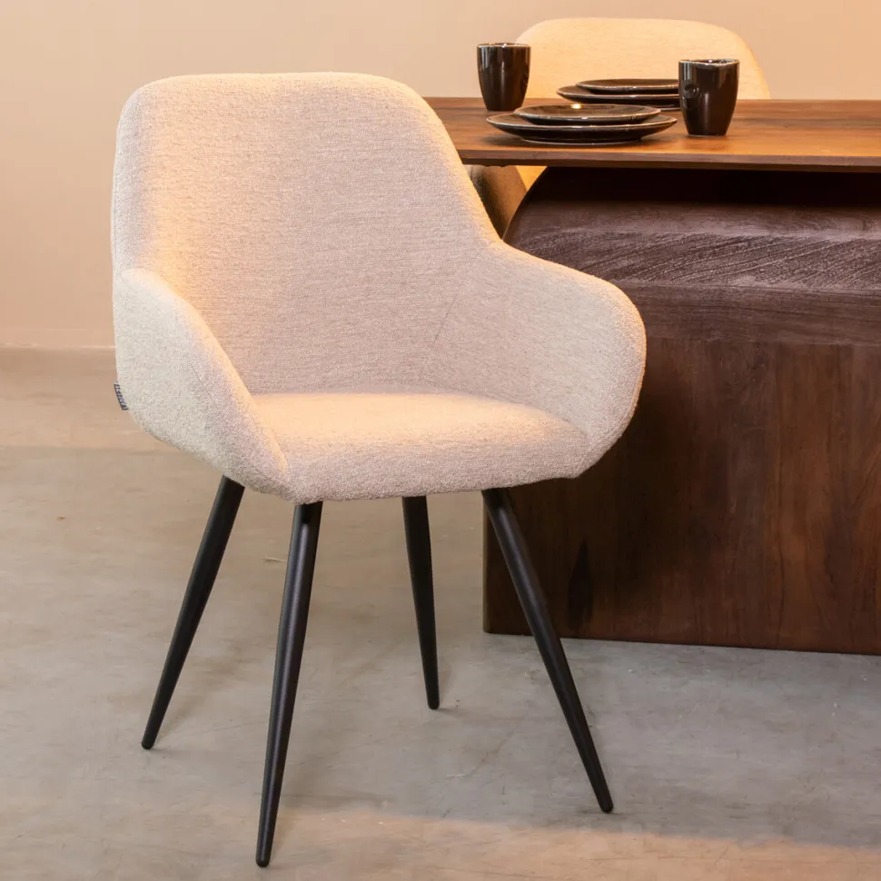 Eetkamerstoel Fender van LABEL51 is een prachtige armstoel uitgevoerd in naturel bouclé waar comfort en verfijning samen komen. De mooie, luxe ronde zitting voorzien van armleuningen in combinatie met de fraaie zwarte poten maken Fender tot een topper in zijn segment.