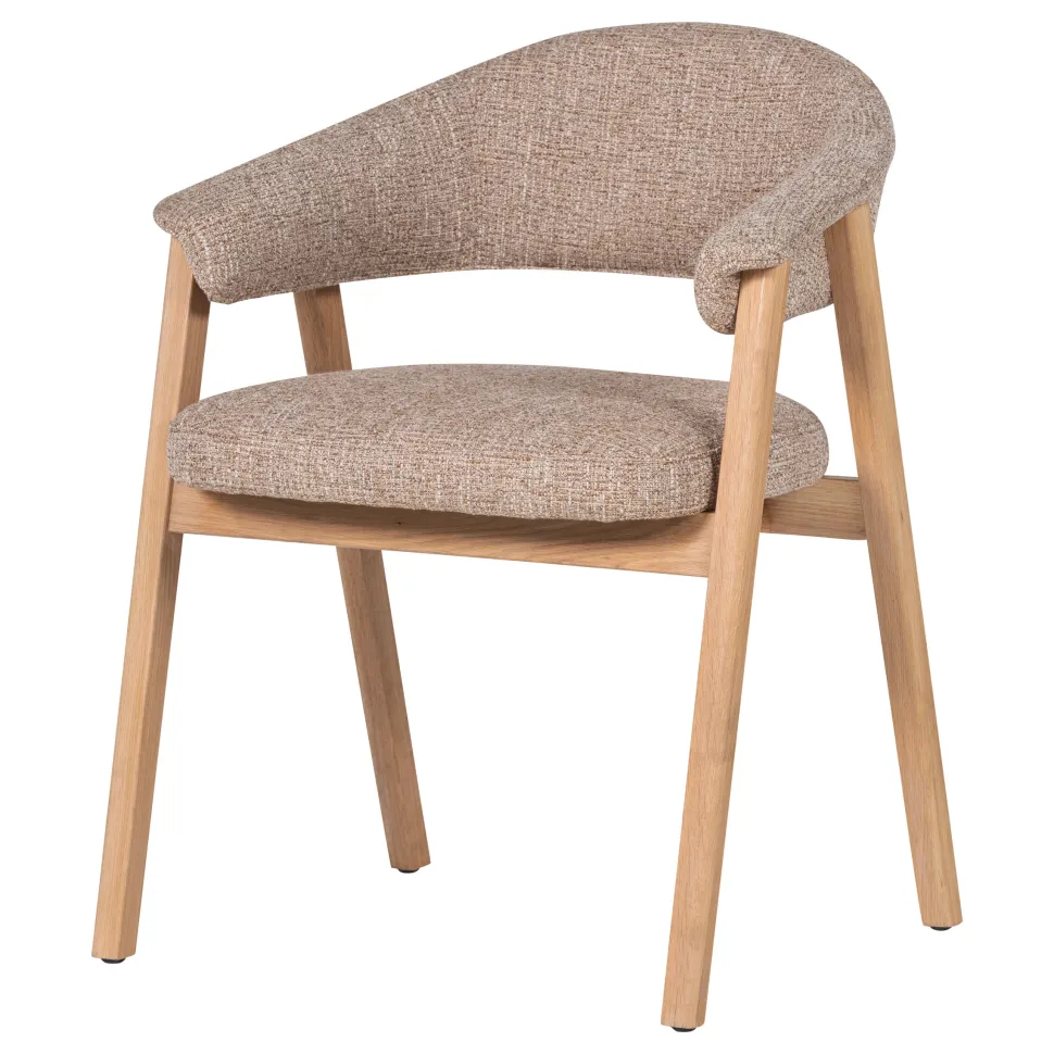 De Tunar eetkamerstoel met armleuning brengt gezelligheid aan je eettafel. Het natuurlijke eikenhout combineert met de bruine stof en creëert een warme uitstraling in je eetkamer. De sterke constructie zorgt ervoor dat je jarenlang kunt genieten van deze stoel. Of je nu ontspannen zit tijdens het diner met vrienden of familie, de Tunar biedt het comfort dat je zoekt. De armleuningen voegen extra ondersteuning toe en maken elk moment aan tafel prettiger. Deze eetkamerstoel van het Nederlandse interieurmerk WOOOD past in meerdere woonstijlen en vormt een uitnodigende plek om aan te schuiven.