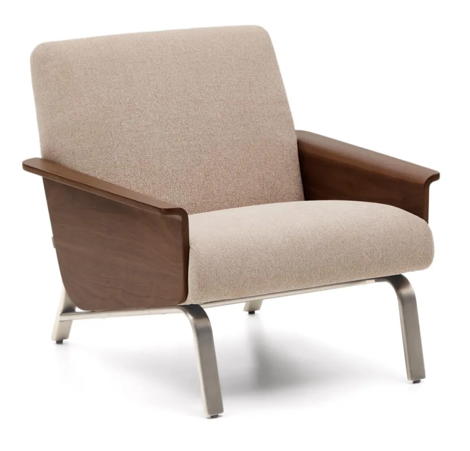 - Fauteuil met chenille bekleding en poten van geborsteld roestvrij staal.