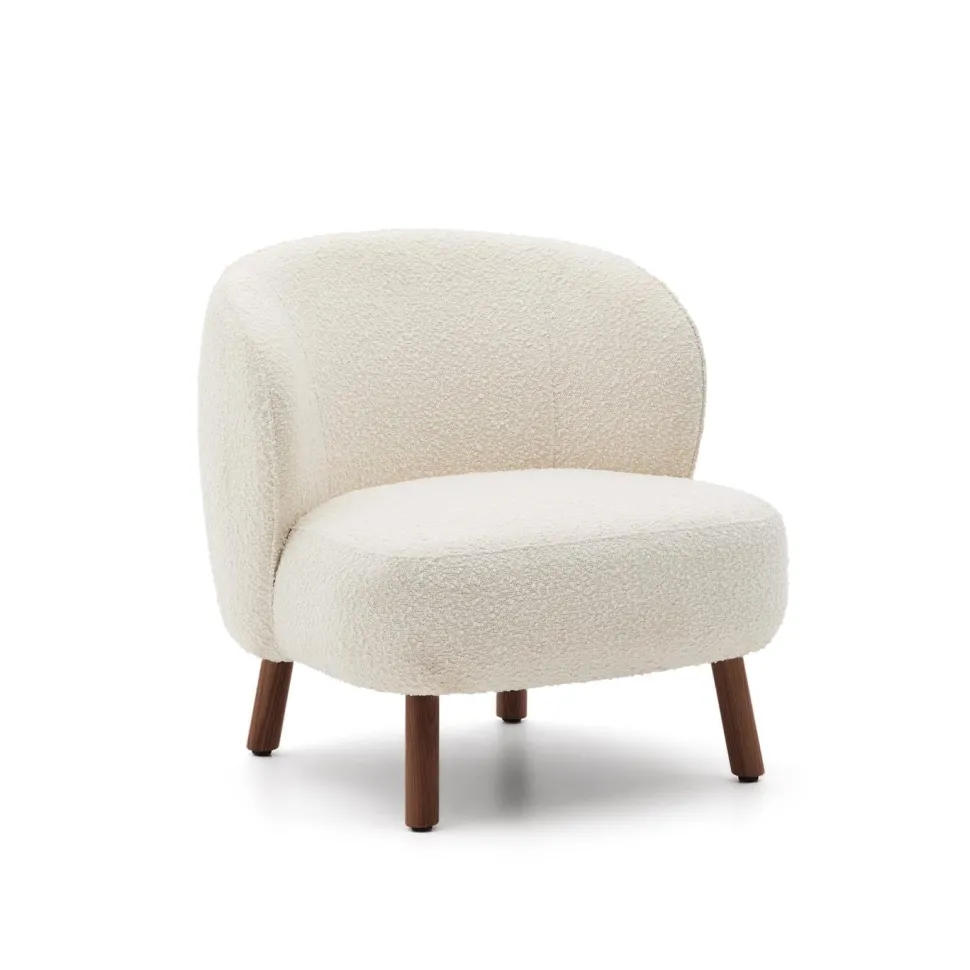 - Fauteuil bekleed met bouclé dat warm aanvoelt.