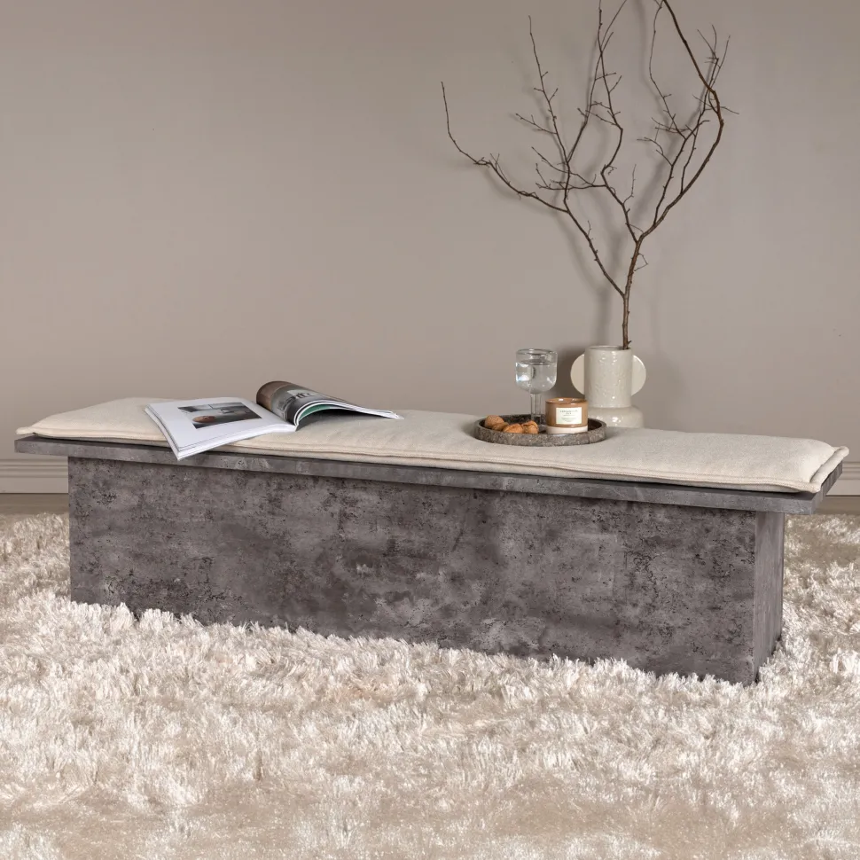 Een bank die helemaal volgens de trends is ontworpen! Deze bank uit de Joany serie heeft een rechthoekige zitting met een beige kussen en een geïntegreerd onderstel in de vorm van een rechthoekig blok in industrieel design. Uitgevoerd in grijze steen-look die een gespikkeld leven geeft aan het meubel. Deze bank is een perfect interieurdetail voor de gang of woonkamer, als solitair stijlicoon of om extra zitplaatsen in huis te creëren.