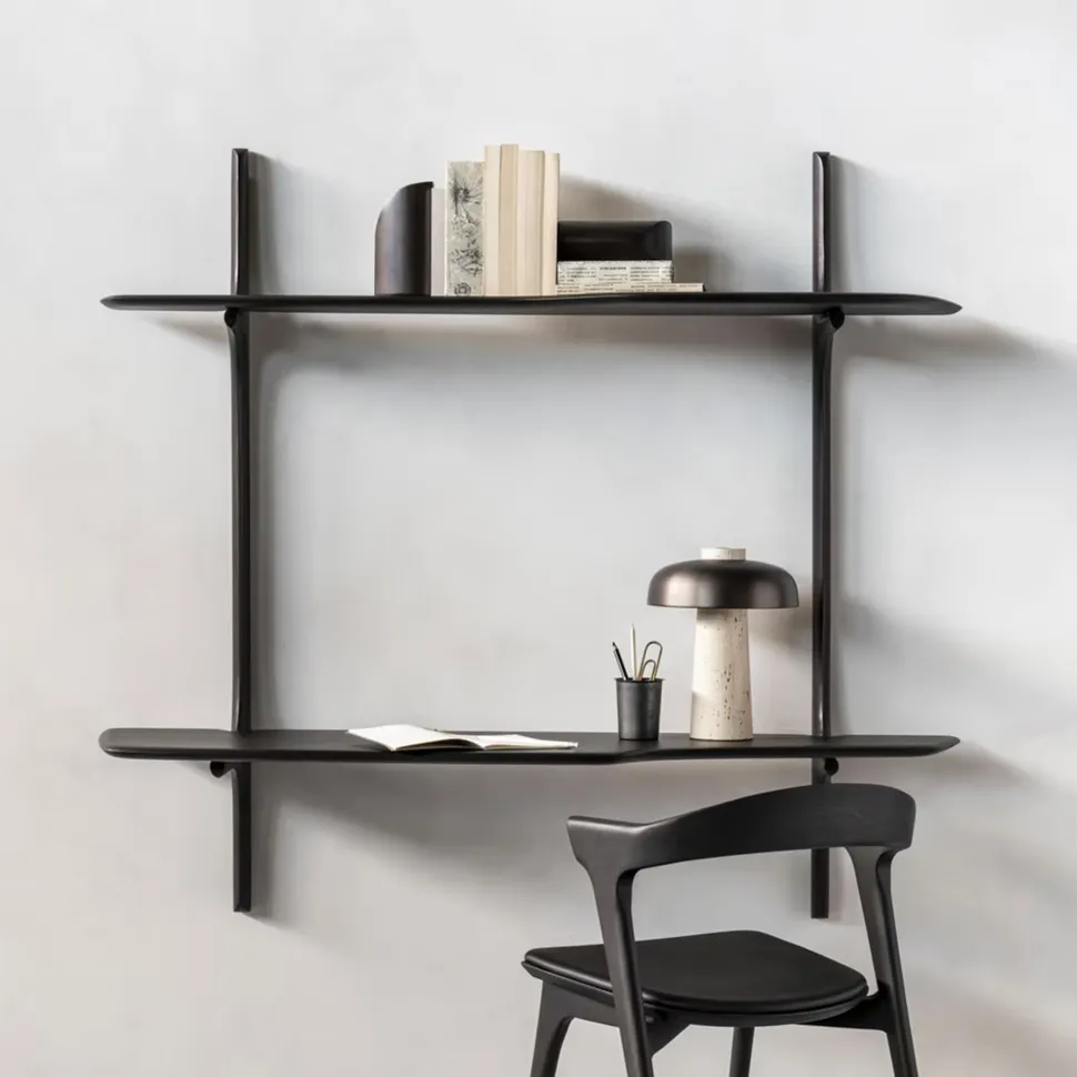 Het hangende bureau PI van Ethnicraft is een verfijnd ontwerp met een luxe uitstraling. Gemaakt van massief mahoniehout en afgewerkt met een donkerbruine vernislaag, straalt het warmte en elegantie uit. Het minimalistische ontwerp toont de natuurlijke schoonheid van het hout, met vloeiende lijnen en zachte rondingen.