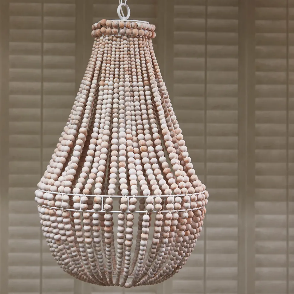 - Deze hanglamp, ontworpen als een subtiele kroonluchter, is vervaardigd uit houten kralen met een verfijnde witte kleur. Het licht straalt sfeervol door de kralen naar buiten, wat een warme en uitnodigende ambiance creëert. De lamp hangt aan een ketting en is ideaal om een stijlvolle en gezellige sfeer in je interieur te brengen.