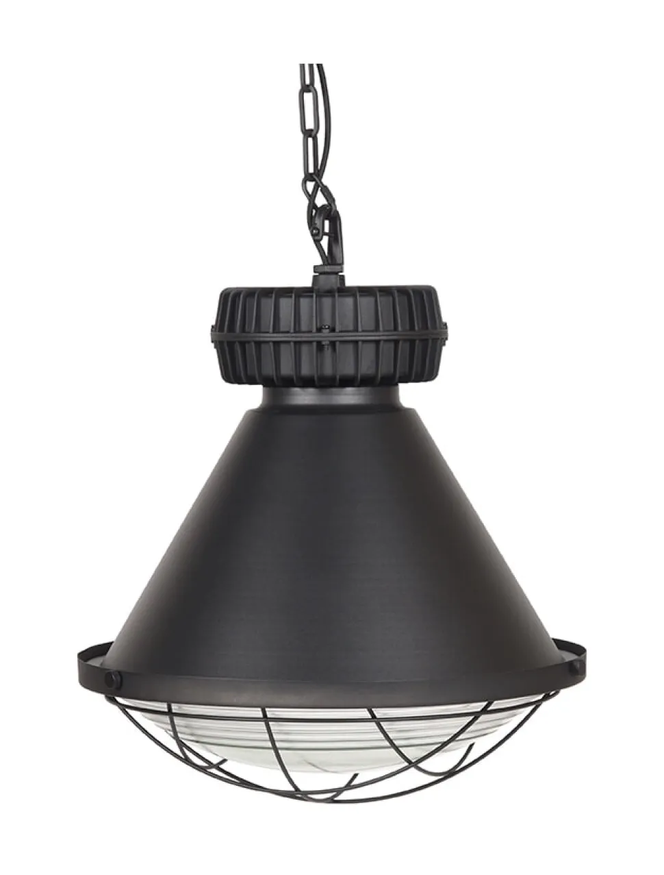 Hanglamp Duisburg bestaat uit een grote rondvormige kap die spits toeloopt naar de zeer fraaie transformatorkast. De kap is gemaakt van fijn afgewerkt metaal en uitgevoerd in de kleur zwart. Hanglamp Duisburg is in het bezit van ontzettend gave details. Zo is de lamp voorzien van een glazen bolvorm met een cirkelvormig patroon aan de buitenzijde van het glas, die zorgt voor een mooie lichtspreiding en heel veel sfeer. De stoere korf en de solide ketting zorgen voor de extra industriële touch.