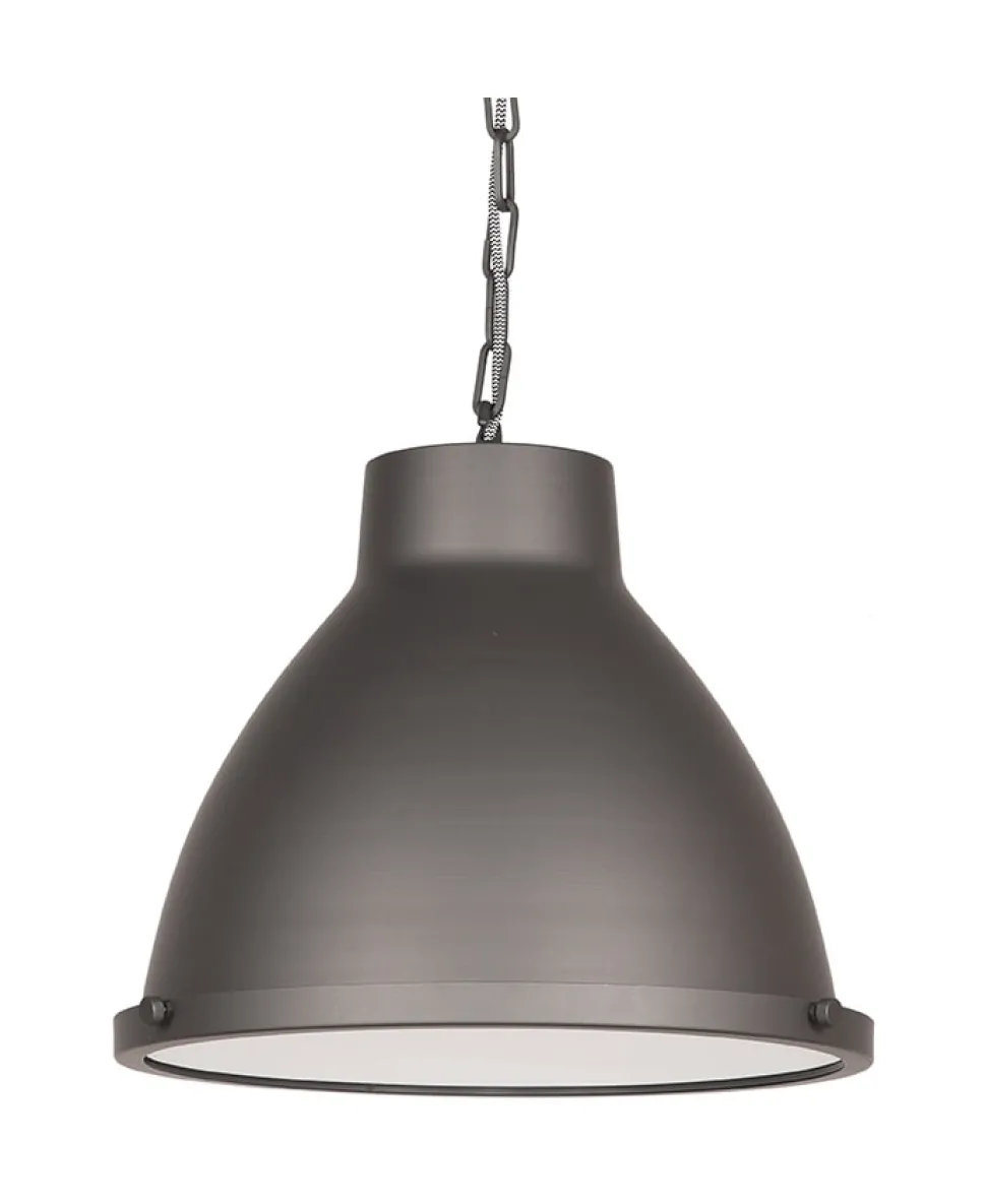 Hanglamp Industry bestaat uit een grote rondvormige kap die licht spits toeloopt. De kap is gemaakt van fijn afgewerkt metaal en uitgevoerd in de kleur burned steel. Hanglamp Industry is in het bezit van zeer fraaie details. Industry heeft een luxe glasplaat, voorzien van robuuste bouten. Deze glasplaat zorgt voor een luxe uitstraling en een mooie lichtspreiding wat zorgt voor extra sfeer.