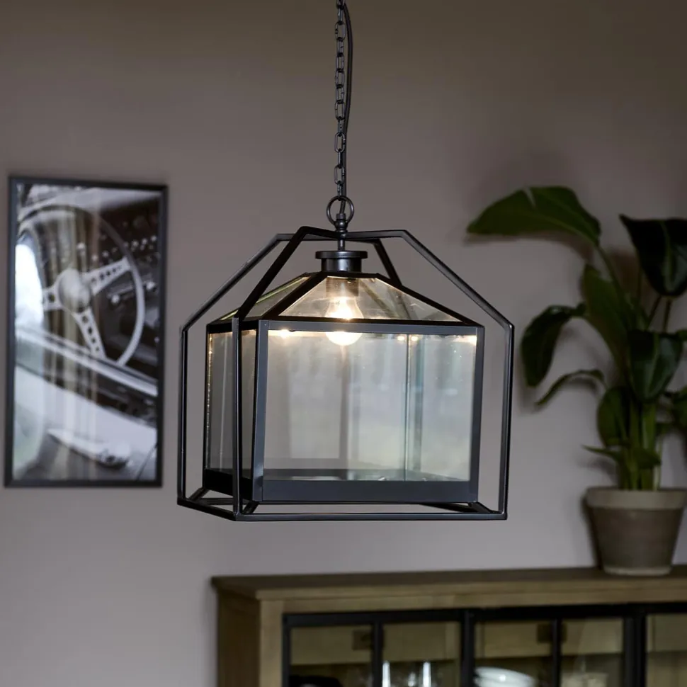 De Rockford-hanglamp heeft een stoer zwart metalen frame met een glazen binnenkant. De huisvormige constructie maken de hanglamp tot een bijzondere blikvanger. De lamp hangt aan een stevige ketting en wordt geleverd met een plafondkapje van eveneens zwart metaal.