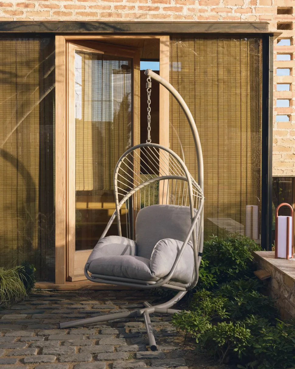 De Livadi hangstoel combineert visuele lichtheid en comfort in een meubel dat ontworpen is om zowel binnen als buiten van te genieten. De stalen structuur maakt hem zeer resistent tegen roest en corrosie, waardoor hij ideaal is voor buitenruimtes. De zitting is gemaakt van handgevlochten beige synthetisch touw, ontworpen om UV-stralen te weerstaan en om er na verloop van tijd mooi uit te blijven zien. Inclusief opklapbare zitting, afneembare voet, ketting met karabijnhaak en kussen met afneembare hoes dat zachtheid en comfort biedt. Dankzij het praktische en functionele ontwerp kan hij gemakkelijk worden opgeborgen als hij niet wordt gebruikt. Om het kussen in perfecte staat te houden, is het aan te raden om het op regenachtige dagen te beschermen. Livadi is een uitnodiging om in stijl te ontspannen en in alle comfort van het buitenleven te genieten.