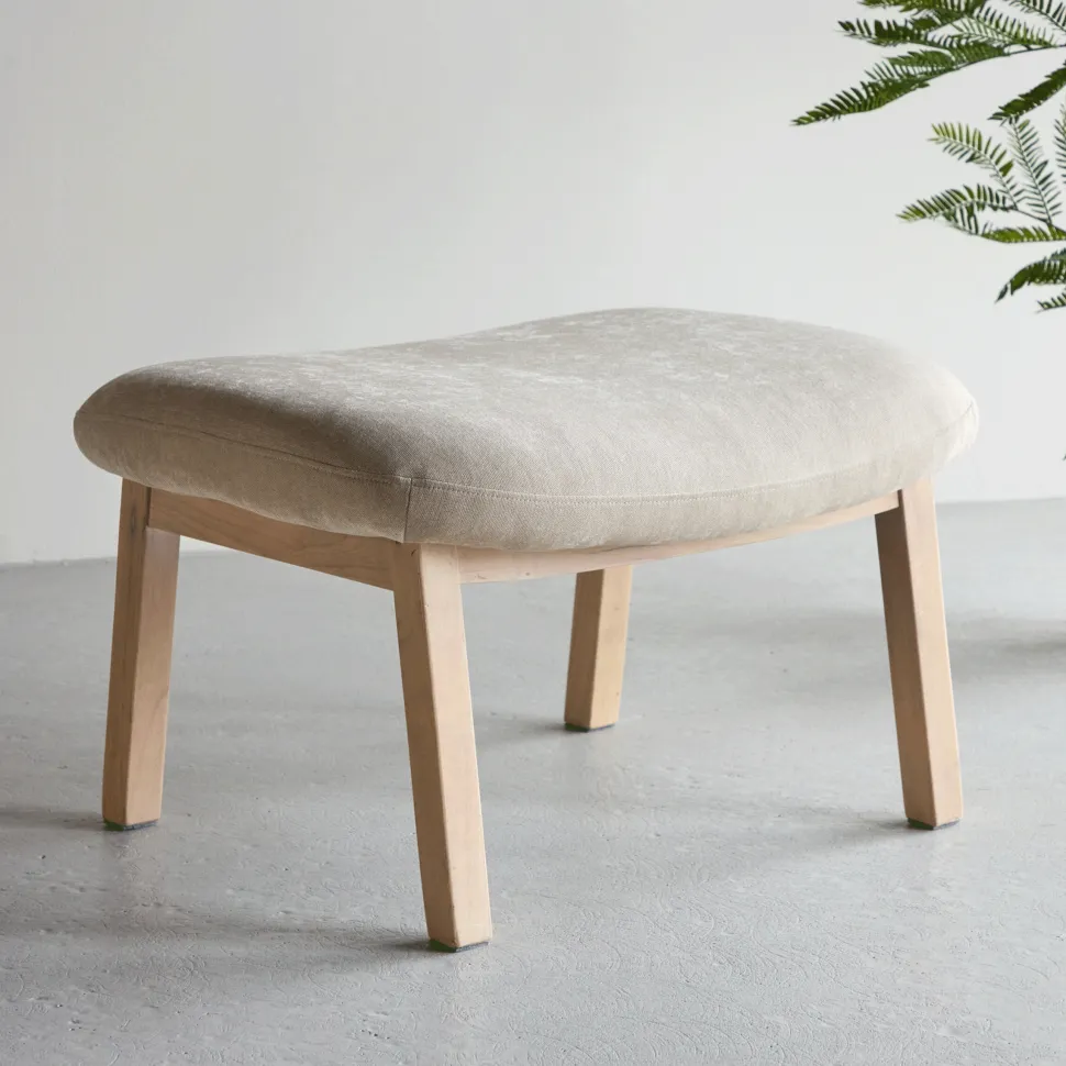 De poef heeft een neutrale beige bekleding die eenvoudige elegantie en een natuurlijk gevoel uitstraalt. De witte rubberhouten poten zorgen voor een mooi contrast en voegen een modern tintje toe, waardoor hij perfect past in verschillende interieurstijlen, van minimalistisch tot klassiek.