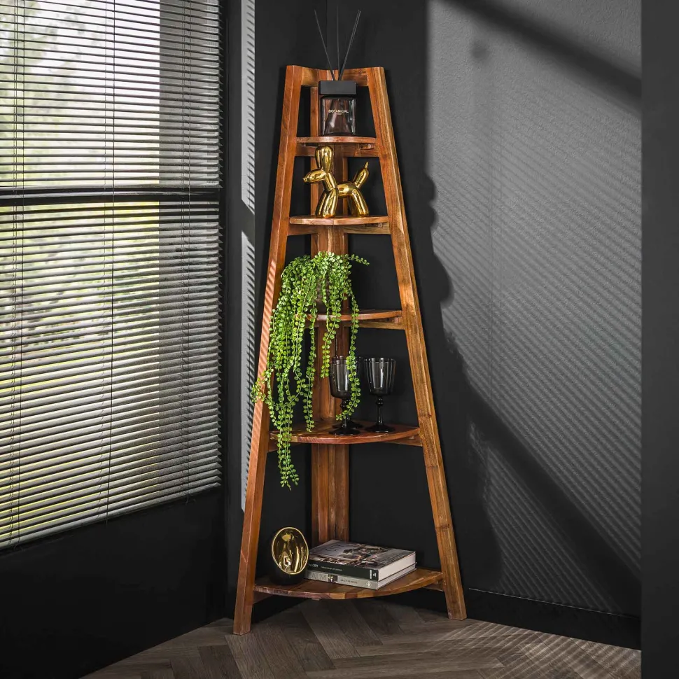 Dit hoekrek is uitgevoerd in mangohout. Het rek beschikt over 5 schapjes. De schapjes beschikken over scharnieren waardoor deze omhoog geklapt kunnen worden wanneer dit nodig mocht zijn. Hierdoor is de verpakking van dit artikel aanzienlijk gereduceerd. Zie hiervoor de foto.