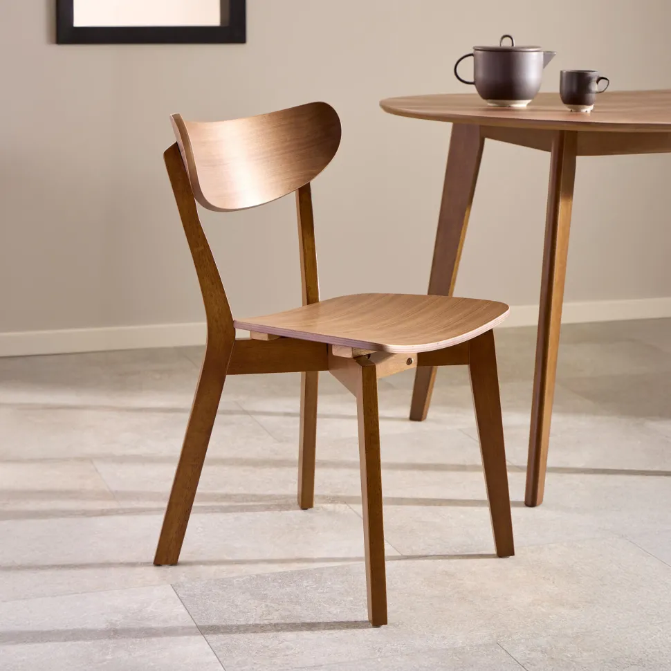 Deze eetkamerstoel is gevormd door een mix van retro en modern design. De zitting van fineer is gemaakt in een natuurlijke eikenhouten look met een gelakte afwerking, laat de eikenhouten textuur zien en wordt ondersteund door stevige poten in een gebeitst eikenhouten look. De stoel biedt een alledaagse zitoplossing die geschikt is voor elke eetkamer.