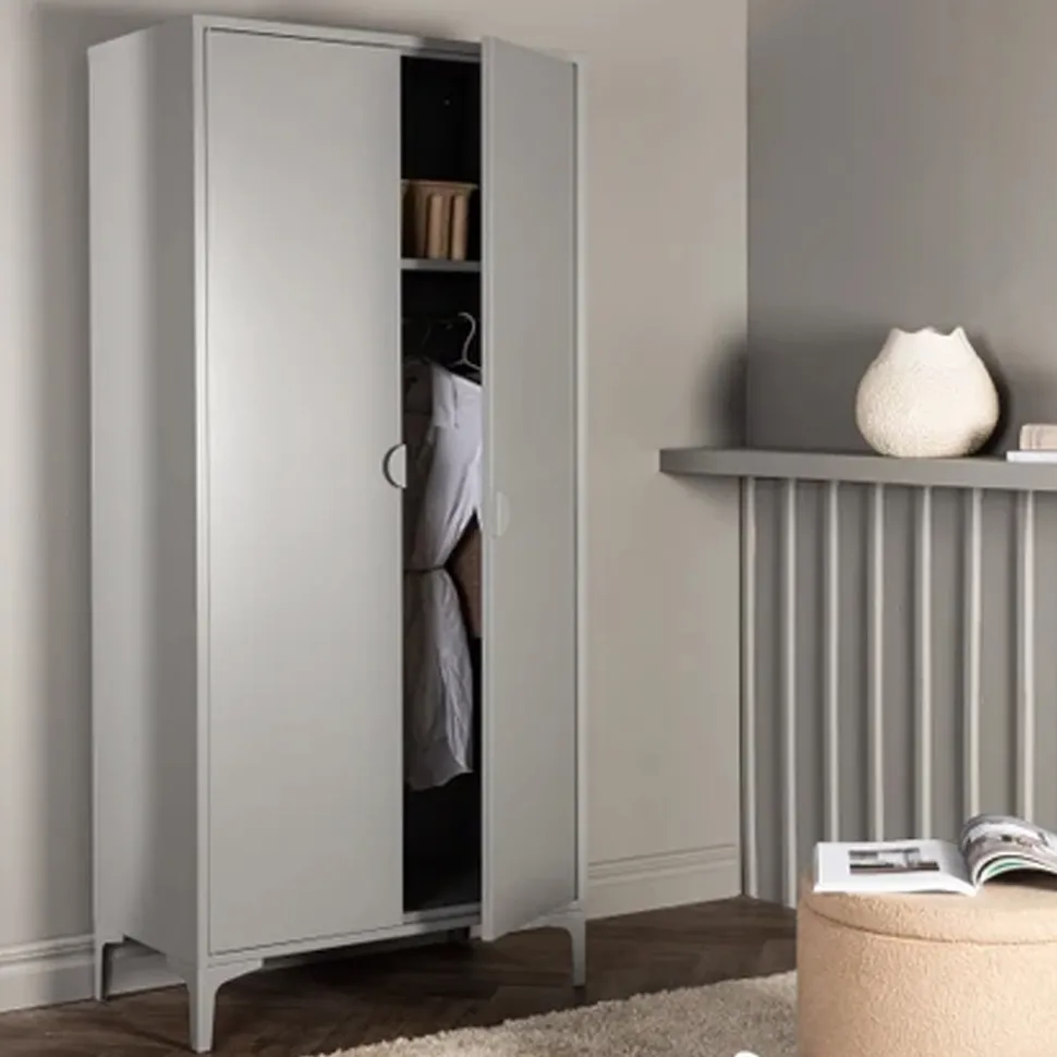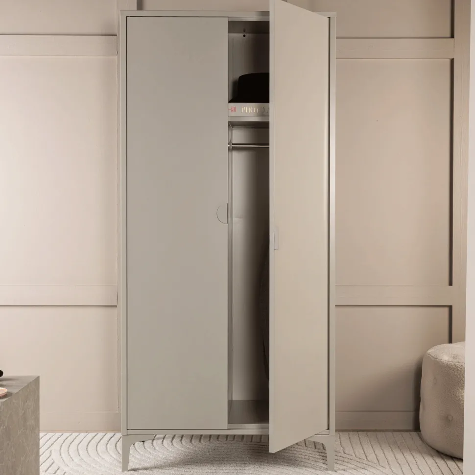 Een slim meubelstuk in harmonieuze kleuren – de kledingkast uit de Danyella serie is de perfecte aanvulling voor de slaapkamer! Deze hoge kledingkast van beige staal heeft twee deuren die opengaan tot vier legplanken en biedt ook ruimte voor hangers zodat de pas gestreken kleding niet gekreukeld hoeft te worden. Danyella wordt opgetild door vier nette poten die een luchtige indruk maken en ook de stofzuiger vergemakkelijken. Investeer in meer opbergruimte voor jezelf en haal met de aankoop een mooi meubelstuk in huis!