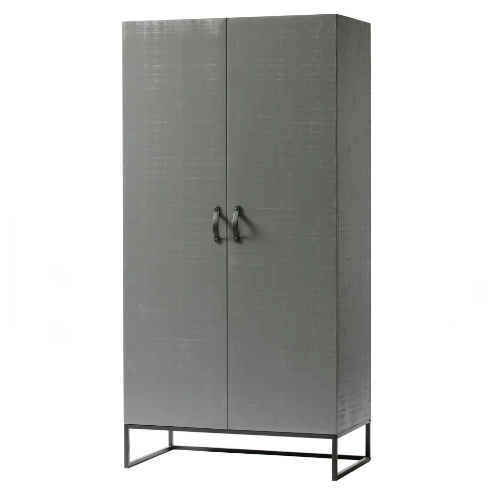 De WOOOD kledingkast Morris is een stoere kast met een praktische indeling. De kast is gemaakt van massief grenenhout en uitgevoerd in een prachtige grijze leemkleur. Het zwarte metalen frame geeft het geheel een slanke, industriële uitstraling, zeker ook door de stoere leren handgrepen in zwart.