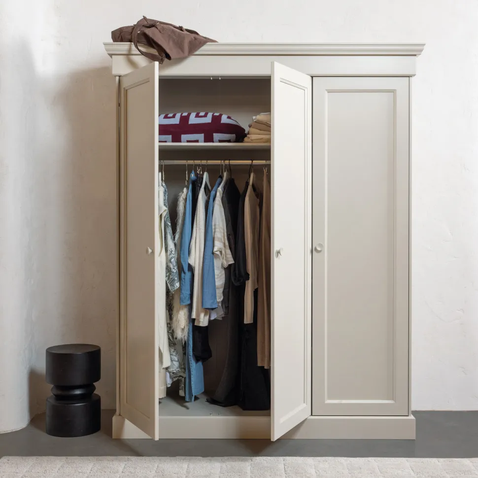 De indeling is praktisch en overzichtelijk: achter de twee brede deuren vind je een legplank en een royale roede voor kleding die netjes opgehangen moet worden. Achter de smalle deur zijn vier planken geplaatst, ideaal voor gevouwen kleding of accessoires. Met het , bestaande uit drie extra planken, verander je de Olivia eenvoudig in een ruime opbergkast.