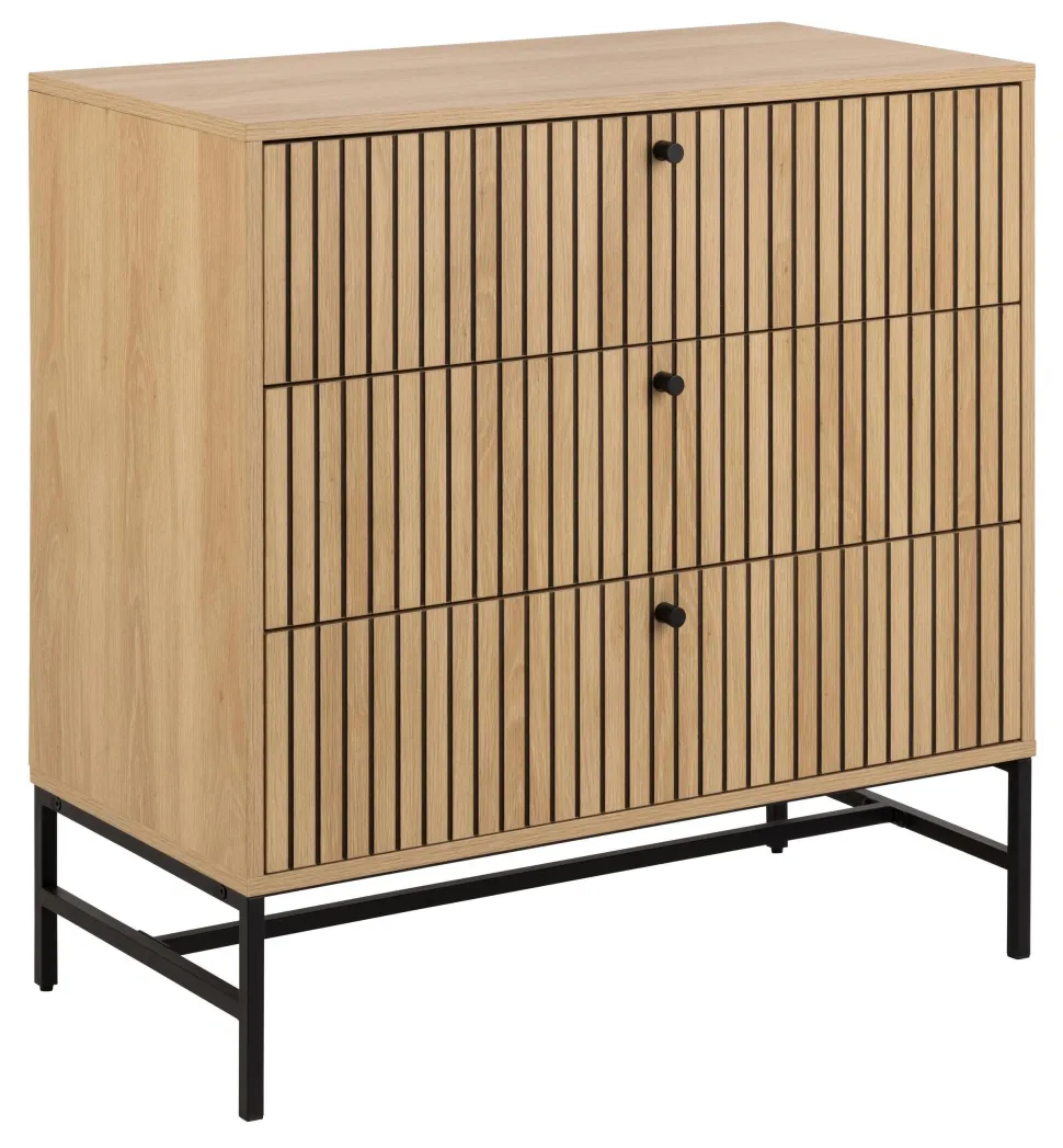Verfraaid in een eikenhouten look met een lamellenfront, weet deze commode de aandacht te trekken. Door te spelen met contrast creëert de eiken look aangevuld met zwarte accenten een evenwichtige visuele aantrekkingskracht. Met 4 lades biedt de ladekast voldoende opbergruimte, terwijl het onderhoudsvriendelijke oppervlak het praktische aspect versterkt.