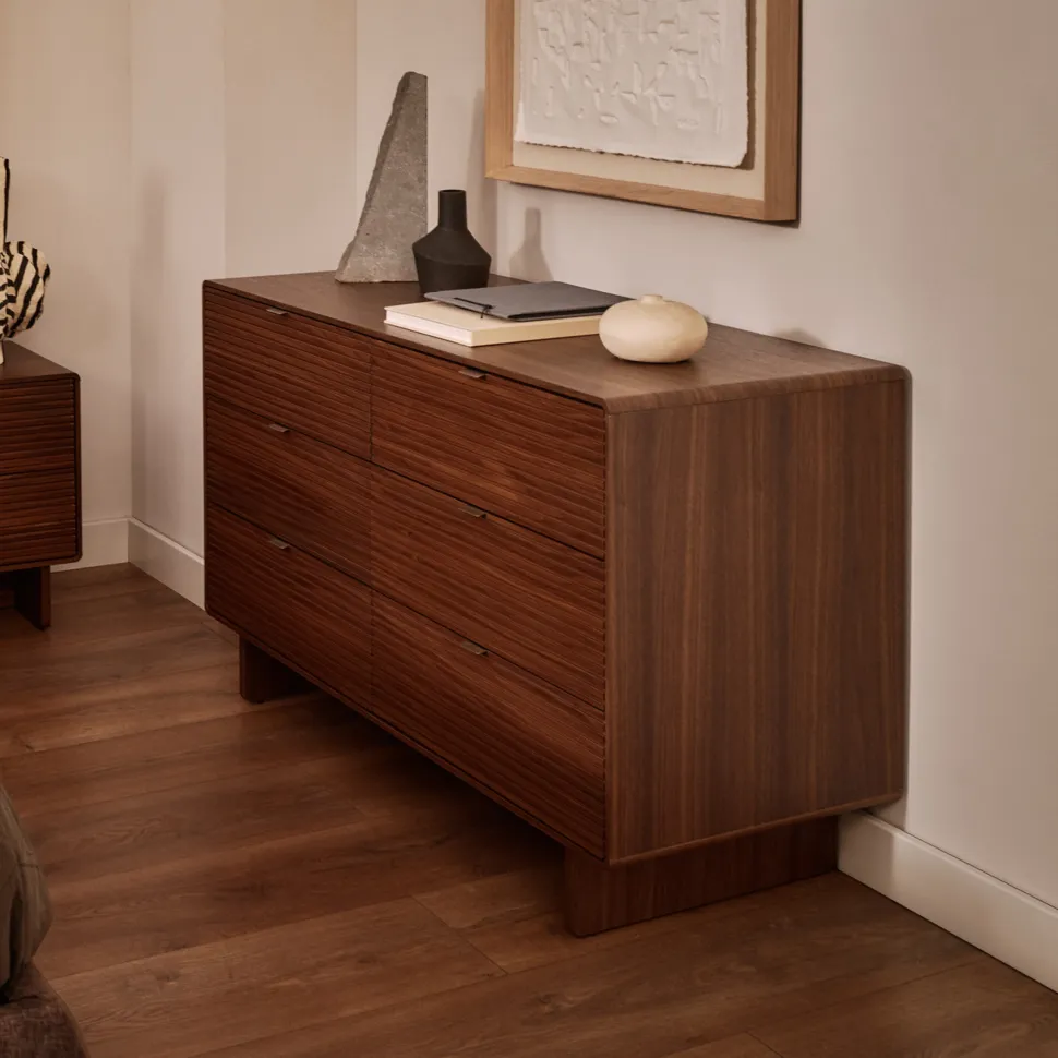 - Commode van walnootfineer met 3 laden met verborgen rails en soft-close systeem.