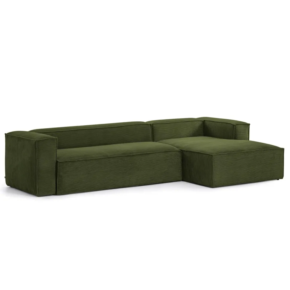 - 4-zitsbank met chaise longue bekleed met dik ribfluweel dat zeer zacht aanvoelt en een hoge weerstand heeft.