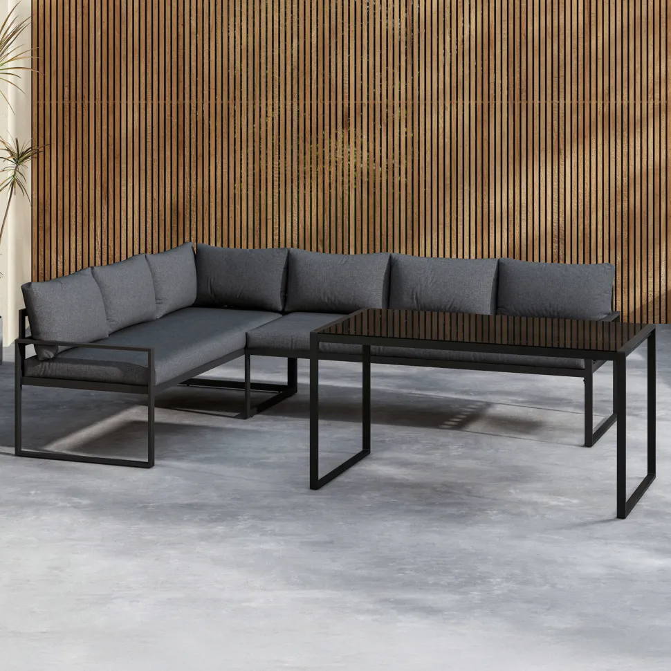 Jenalee is het bankstel dat elegantie en functionaliteit combineert voor je terras. Met een strak zwart frame en grijze kussens van duurzaam polyester creëert Jenalee een moderne en uitnodigende sfeer. De hoekbank biedt voldoende ruimte voor het hele gezin om samen te komen en te genieten van gezellige momenten, of het nu gaat om een heerlijke avond of een ontspannen dag buiten.