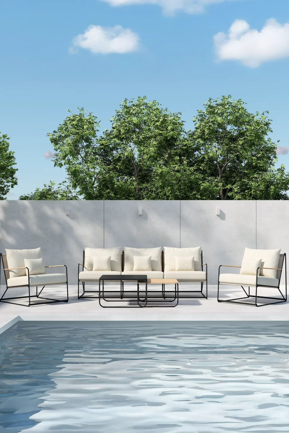 De Markesha bankenset is een elegante en strakke buitenmeubelgroep die je terras een luxe uitstraling geeft. Met twee comfortabele fauteuils, een ruime bank en een bijpassende tafel is deze set ontworpen om een uitnodigende plek te creëren om samen te komen en te genieten van warme zomerdagen. Het stevige beige stalen frame zorgt voor stabiliteit en een modern tintje, terwijl de kussens in een zachte beige tint zowel comfort als esthetiek toevoegen. De kussens zijn gemaakt van duurzaam Textilene en polyester, waardoor ze perfect zijn voor buitengebruik en gemakkelijk te onderhouden. Het Markesha bankstel combineert vorm en functie op een manier die je terras naar nieuwe hoogten tilt.