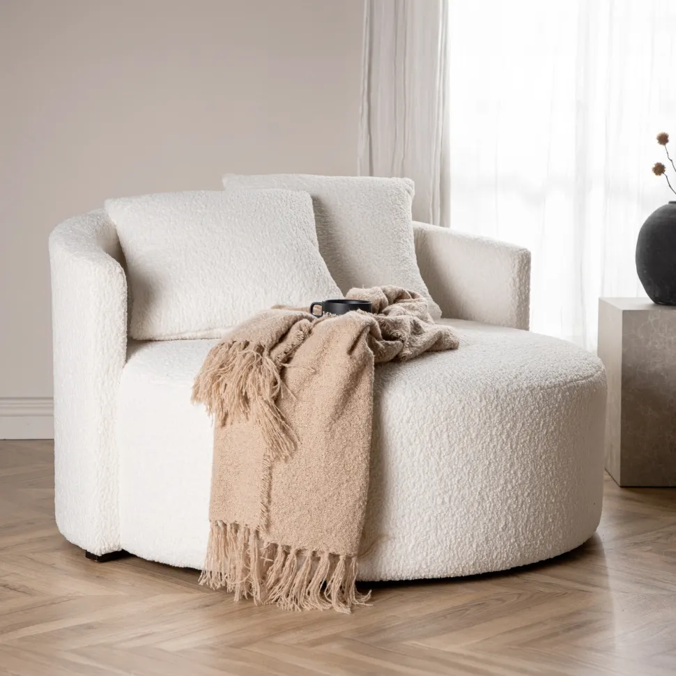 Een romantische tweezitsbank met uitnodigend rond ontwerp en knusse vormgeving zal het stijlniveau in je huis zeker verhogen! De bank uit de Keeli serie behoort tot de Nohr collectie en heeft een volledig aangeklede bekleding in witte teddy stof met een ronde rug, cilindervormige zitting en twee kussens. Deze bank past perfect in de moderne woning en creëert al snel een aangename blikvanger in de woonkamer!