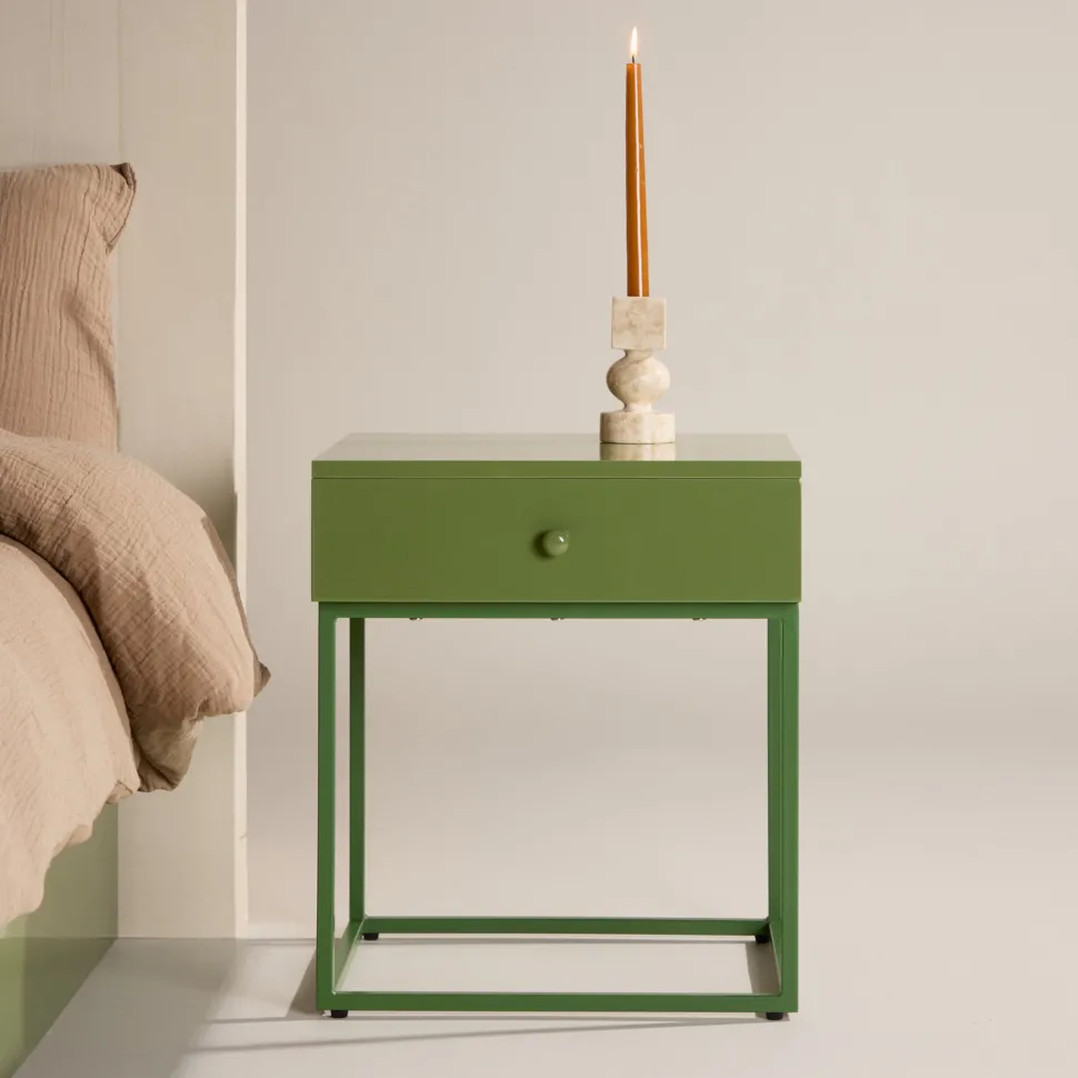 Met een toffe mix van tijdloos design en Scandinavische inspiratie verandert dit stijlvolle beige nachtkastje je slaapkamer in een plek waar stijl en orde samenkomen. Het nachtkastje heeft een handige lade voor verborgen opbergruimte, versierd met een mooie messingkleurige knop die het geheel helemaal afmaakt. Bewaar je avondboek, bril of kleine schatten handig binnen handbereik.