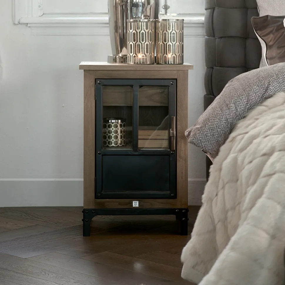 Het nachtkastje uit de Hoxton-serie is net als de andere items uit deze lijn gemaakt uit een combinatie van gerecycled essenhout, zwartgekleurd ijzer en glazen panelen die het kastje afsluiten voor vuil en stof. Bij de Hoxton nachtkastjes wordt onderscheid gemaakt in een kastje voor de linkerzijde van het bed en een kastje voor de rechterzijde. Het verschil zit in de positie van de handgreep.