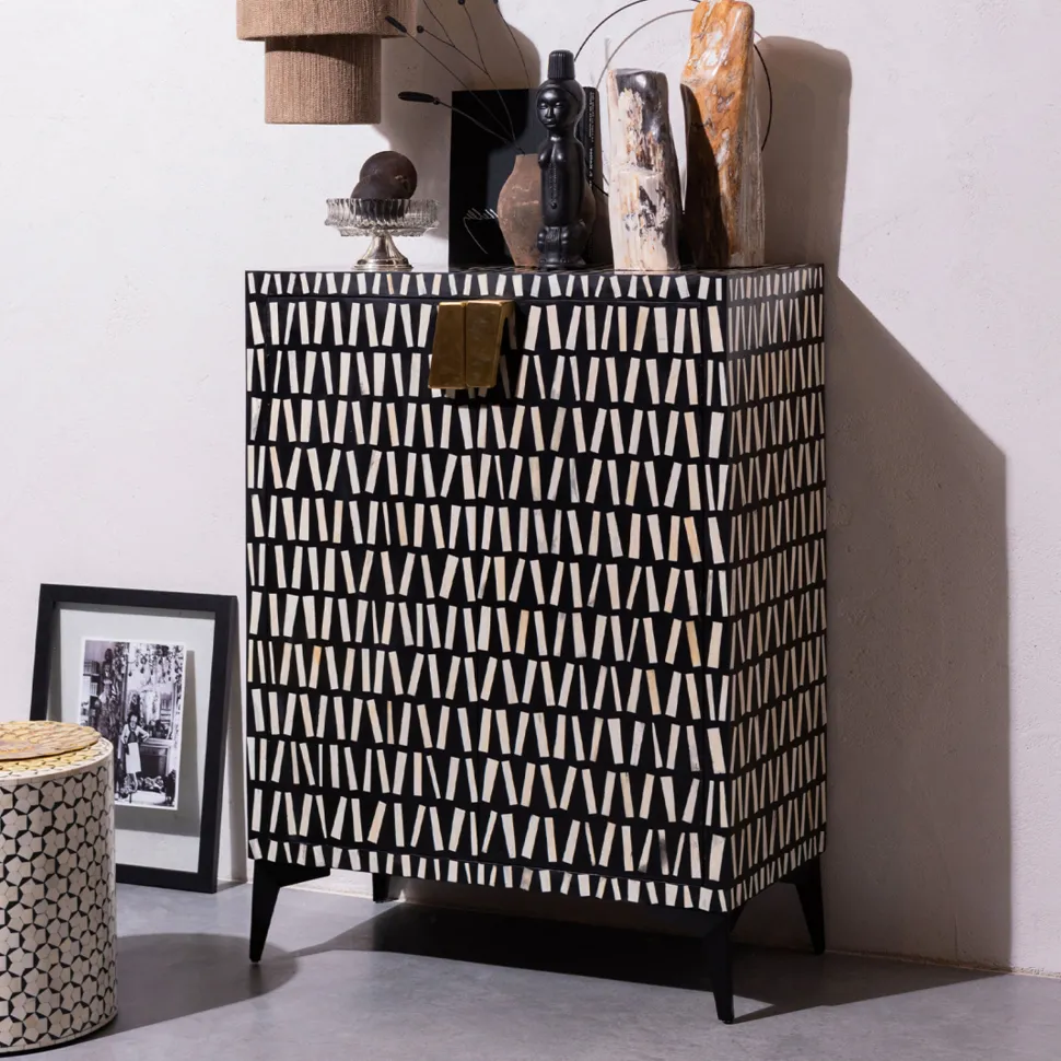De Menne opbergkast, uit de Exclusive collectie van het Nederlandse interieurmerk WOOOD, is een ware blikvanger in huis en heeft bijzondere features. Zo is het frame van Menne gevormd uit matzwart mangohout en het onderstel van gepoedercoat metaal. Het unieke aan Menne is de buitenzijde met bone inlay, dit duurzaam ingewonnen materiaal is afkomstig vanuit slachtafval om zo dit unieke en opvallende interieurstuk te versieren!
