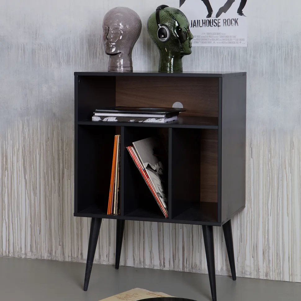 Het kastje is speciaal ontwikkeld om in de 3 vakken aan de onderzijde LP’s te plaatsen ( H 35 x B 18 cm). Het brede vak bovenin is ontworpen om de versterker in te plaatsen, daar is namelijk een gat in de achterzijde van het kastje gemaakt om je snoeren doorheen te halen. Je kunt het kastje natuurlijk ook gebruiken voor andere functies!