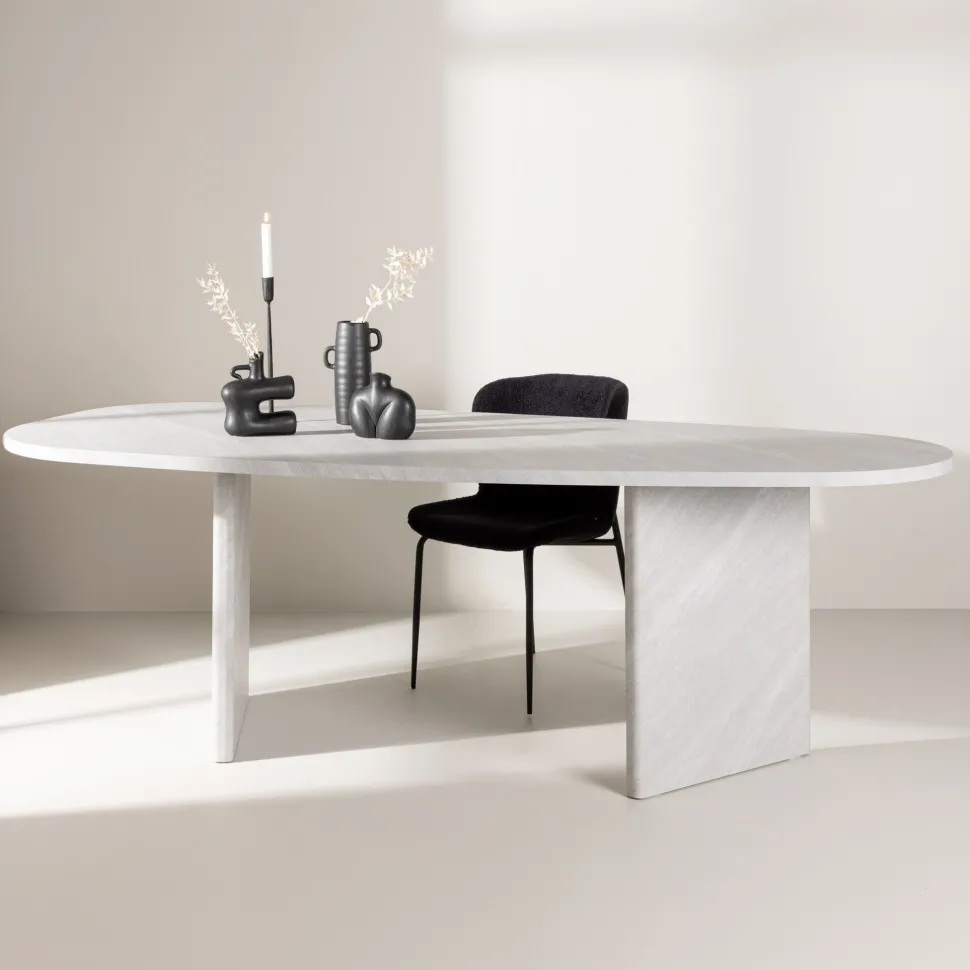 De tafel rust op twee smalle, lange poten die speels geplaatst zijn. Dit geeft een luchtige en elegante uitstraling aan het geheel. De ‘Jenea’ eettafel is perfect voor wie op zoek is naar een unieke mix van stijl en elegantie.
