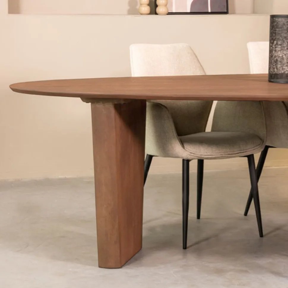 De twee robuuste poten aan weerszijden zorgen voor een stevige basis en geven de tafel een eigentijdse, maar subtiel stoere look. Een ideale keuze voor wie houdt van een warme, uitnodigende eetsfeer met een natuurlijk accent.