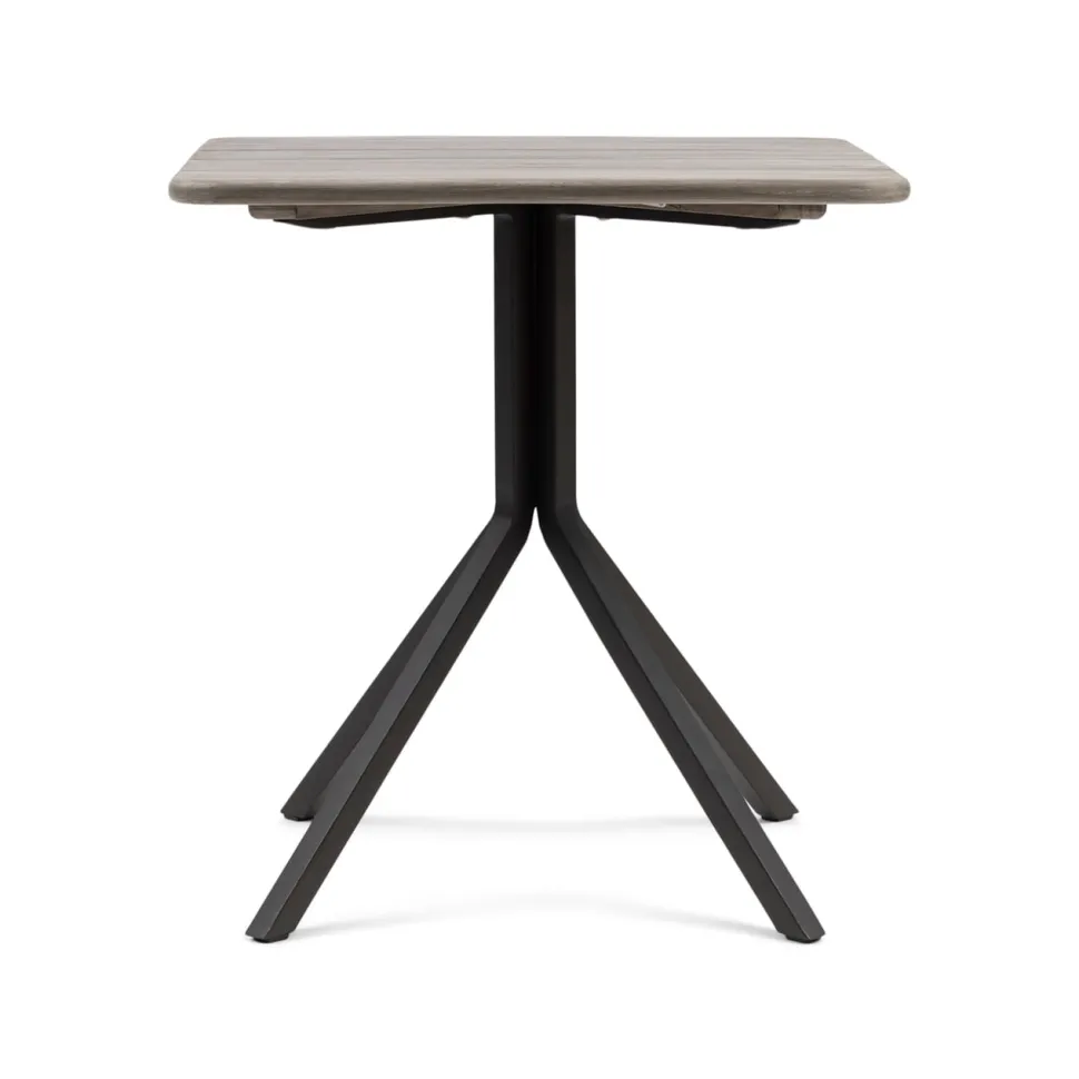 Bistrotafeltje voor buiten, om lekker aan te eten, of voor je koffie of drankje. Op een vierpoot van donkerbruin aluminium die uit het midden naar de hoeken gaat, ligt een prachtig panelenblad van teakhout. De combinatie heeft een industrieel karakter. Eigentijds en karakteristiek.