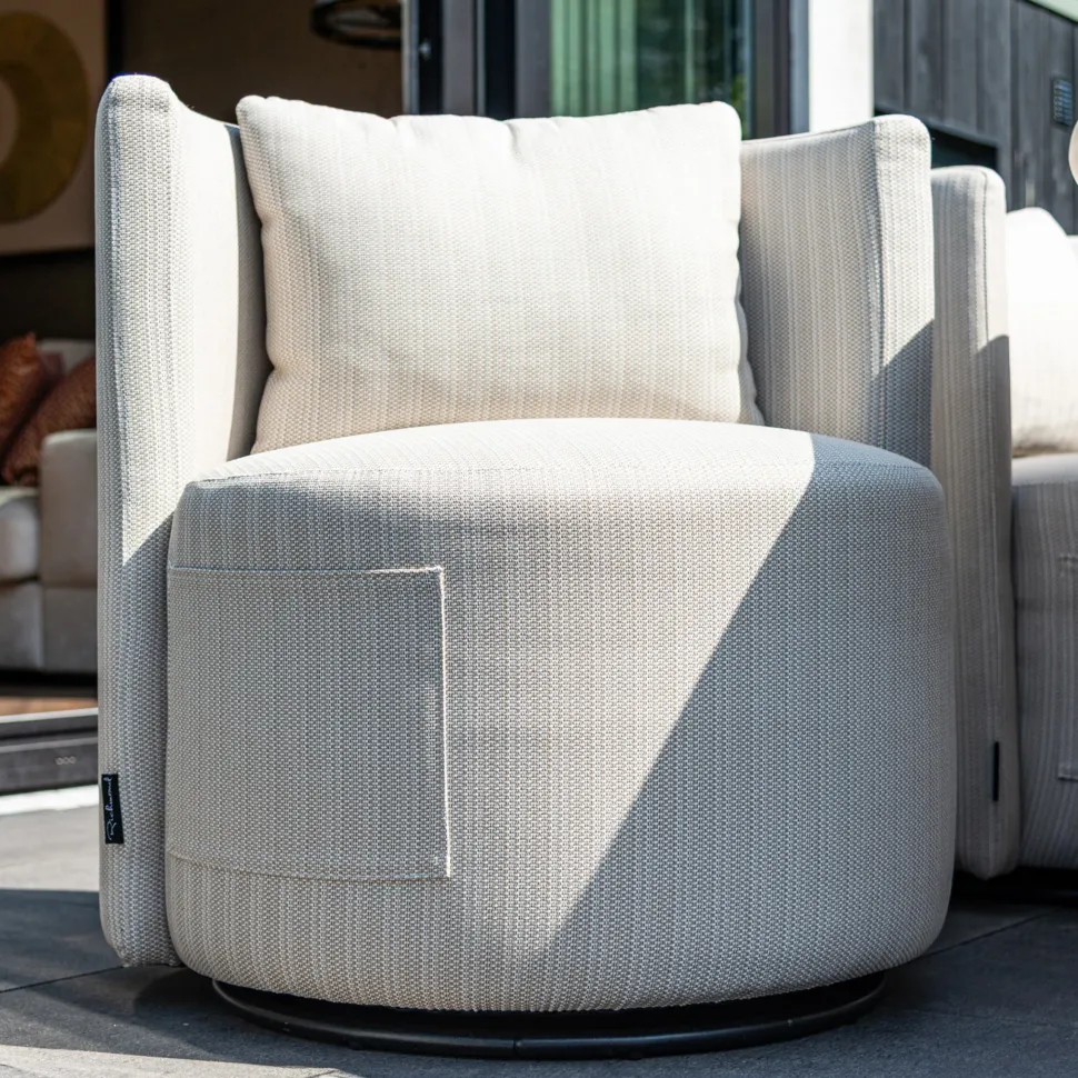 De outdoor draai-eetkamerstoel Marlin combineert luxe en functionaliteit in een elegant design. Met zijn stijlvolle beige kleur en hoogwaardige, weerbestendige materialen is deze stoel ideaal voor buitengebruik. Het draaibare ontwerp voegt extra gebruiksgemak toe, terwijl de stoel is gemaakt voor langdurig zitplezier. Een perfecte keuze voor een verfijnde buitenruimte.