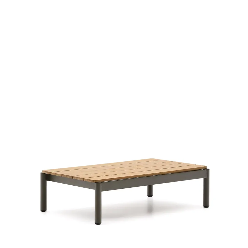 Aquí tienes el texto revisado para sonar más natural en neerlandés: De salontafel van aluminium met een teakhouten blad is een meubelstuk dat functionaliteit, design en duurzaamheid combineert om elke buitenruimte te verfraaien. Exclusief ontworpen voor Kave Home door Made Studio, heeft de tafel een lichtgewicht aluminium frame dat tegelijkertijd zeer sterk is. Dit maakt het ideaal voor langdurig gebruik buiten, aangezien het bestand is tegen oxidatie, corrosie en de schadelijke effecten van UV-stralen. Het teakhouten blad voegt een extra dosis verfijning en warmte toe, en staat bekend om zijn uitzonderlijke weerstand en duurzaamheid in buitenomgevingen. Dit edele materiaal is perfect bestand tegen vocht, waardoor het zelfs onder de meest veeleisende omstandigheden zijn kracht behoudt. Met een ontwerp dat gericht is op veelzijdigheid, kan deze tafel perfect worden gecombineerd met andere tafels uit dezelfde collectie. Zo kun je sets van verschillende hoogtes creëren die passen bij jouw stijl en wensen. Het elegante afwerkingsniveau geeft een frisse, moderne uitstraling en past moeiteloos in elke buitenomgeving. Het is het ideale meubel voor wie op zoek is naar tijdloos design, zonder concessies te doen aan kwaliteit of functionaliteit. Met Sorells stel je jouw ideale bank samen, door de modulaire elementen af te stemmen op jouw persoonlijke behoeften en levensstijl. Het is de perfecte combinatie van modern design, hoogwaardige materialen en comfort, die jouw buitenmomenten opnieuw definieert.