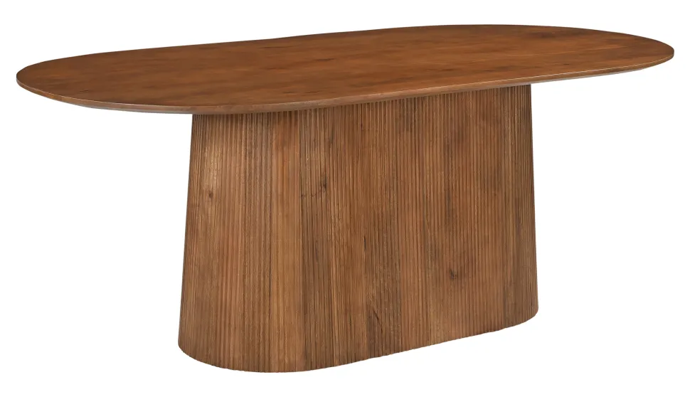 Deze massief mangohouten tafel combineert natuurlijke elegantie met modern design. Met een royaal tafelblad van 180×100 cm biedt de tafel veel ruimte voor gezamenlijke maaltijden en sociale bijeenkomsten. De ovale vorm van het tafelblad creëert een zachte, uitnodigende esthetiek en bevordert een aangename gesprekssfeer. De tafel is gemaakt van hoogwaardig massief mangohout en maakt indruk door zijn stabiliteit en de natuurlijke nerf van het hout, die karakter en warmte toevoegt aan elke kamer. Mangohout is niet alleen robuust en duurzaam, maar ook gemakkelijk te onderhouden, zodat de tafel jarenlang in perfecte staat zal blijven. De ovale voet in lattenontwerp is een ander designelement dat de tafel een moderne, maar tijdloze uitstraling geeft. De voet zorgt voor een stabiele basis en voegt een subtiele textuur toe aan de tafel, waardoor het een uniek meubelstuk wordt. Deze tafel kan gemakkelijk worden geïntegreerd in verschillende interieurstijlen en is perfect voor eetkamers, keukens of kantoren. Met zijn natuurlijke elegantie en functionele vorm wordt het een stijlvol middelpunt in je huis.