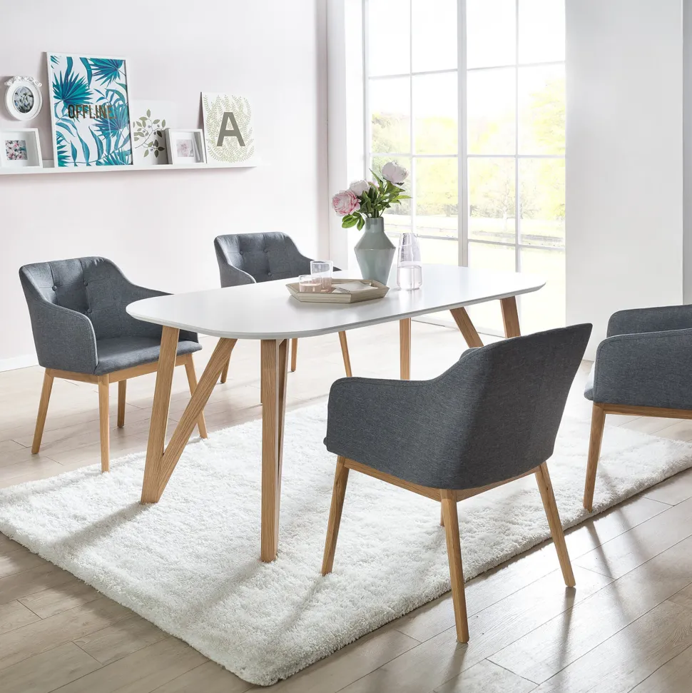 De moderne eettafel in Scandinavische stijl heeft een mat wit gelakt tafelblad. Dit biedt voldoende ruimte voor familie en vrienden. Het schuine houten frame van massief eikenhout zorgt niet alleen voor een veilige stand, maar biedt ook een mooi contrast met het witte ovale tafelblad. Dankzij het eenvoudige ontwerp past de eetkamertafel niet alleen in de meest uiteenlopende woonstijlen, maar is hij ook heel gemakkelijk schoon te maken.