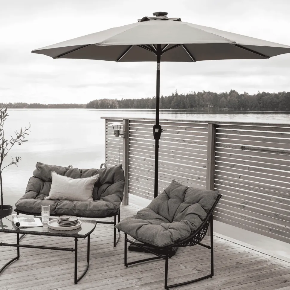 Een vrijstaande parasol met zwarte stof, perfect voor luie dagen in de schaduw! Verplaats hem naar behoefte op je terras. De LED-verlichting geeft ’s avonds een gezellig licht.