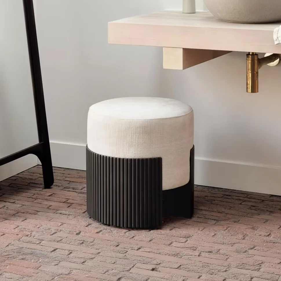 De Roller Max collectie valt op door zijn ontwerp met geritmeerd houten effect. De poef is een multifunctioneel item dat het comfortabele bekledingskussen inkapselt in het donkerbruine gelakte mahonie.