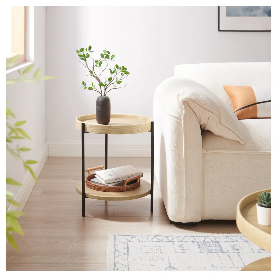 De bijzettafel met een diameter van 44 cm en twee planken combineert modern design met hoge functionaliteit. Het is de perfecte aanvulling voor elke woonkamer, slaapkamer of kantoor waar zowel esthetiek als nut nodig zijn. De tafelbladen zijn gemaakt van een hoogwaardige vezelplaat met gemiddelde dichtheid (MDF), die is afgewerkt met een fijn essenfineer en zorgvuldig gelakt. Dit materiaal wordt gekenmerkt door zijn stabiliteit en duurzaamheid en biedt bovendien een aantrekkelijke, natuurlijke houtlook. Het metalen frame heeft een matte poedercoating, waardoor de tafel een tijdloze elegantie heeft en beschermd is tegen krassen en slijtage. Dankzij het moderne uiterlijk past de bijzettafel naadloos in verschillende interieurstijlen, of het nu Scandinavisch, minimalistisch of industrieel is. De twee planken bieden genoeg ruimte voor alledaagse voorwerpen zoals boeken, tijdschriften, decoraties of drankjes. Met zijn eenvoudige en elegante ontwerp plaatst deze bijzettafel stijlvolle accenten in elke kamer en maakt indruk met zijn solide afwerking en veelzijdige functionaliteit.