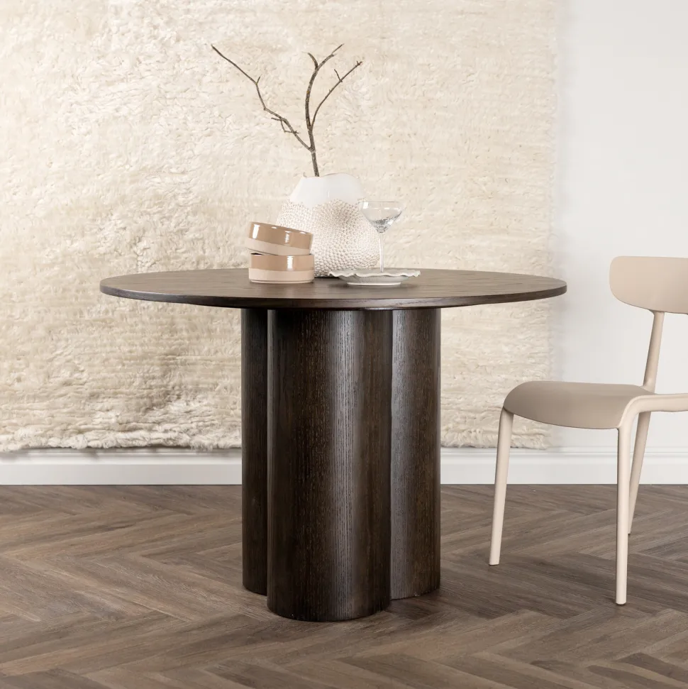 De stevige kolompoot zorgt voor een stabiele basis en geeft de tafel een moderne, minimalistische uitstraling. Dankzij het ronde design bevordert de ‘Anh’ eettafel een gezellige en uitnodigende sfeer, perfect voor een harmonieuze en stijlvolle eetruimte.