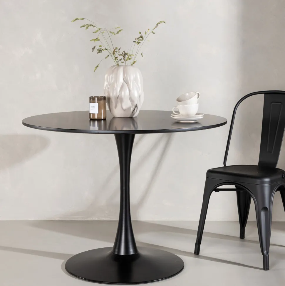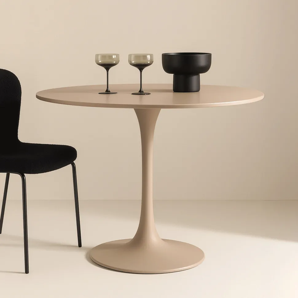 Nicos is een strakke eettafel met een ronde vorm die een gezellige sfeer in de kamer creëert. Met een diameter van 100 cm is hij perfect voor kleinere keukens of sociale ruimtes waar nabijheid belangrijk is. Het gelakte MDF tafelblad in een zachte beige tint wordt in balans gehouden door een slank stalen frame – een combinatie die de tafel een moderne, Scandinavische uitstraling geeft. Nicos is eenvoudig, elegant en gemakkelijk om je bij thuis te voelen.