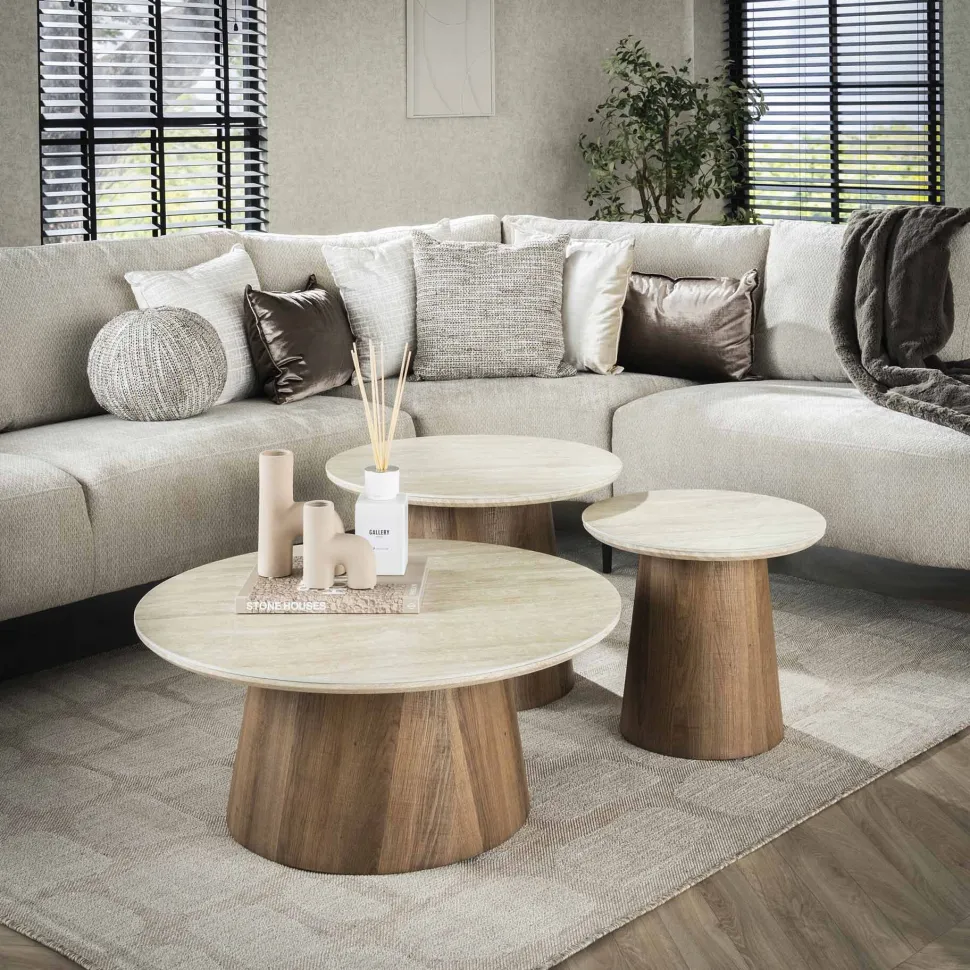 De LifestyleFurn Laycie salontafel combineert een moderne uitstraling met een warme, natuurlijke sfeer. Het ovale blad van keramiek in travertinlook geeft je woonkamer een rustige en stijlvolle basis. De zachte kleurtinten en subtiele steenstructuur zorgen voor een gezellige, luxe uitstraling zonder te opvallend te zijn. Zo past deze tafel moeiteloos in een modern, minimalistisch of chic interieur.