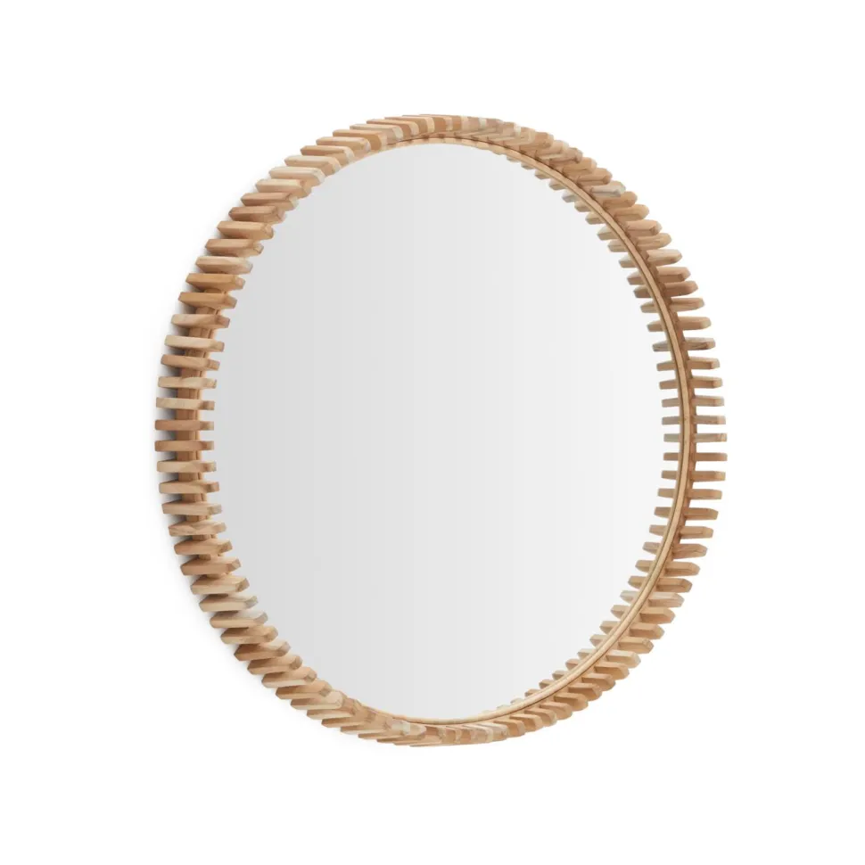 De Polke spiegel heeft een frame van uitgesneden stukken, stuk voor stuk geplaatst, van massief natuurlijk teakhout. Het is een stuk met een aanpasbare diameter voor elke ruimte en een ontwerp dat past bij elke trendsettende stijl.