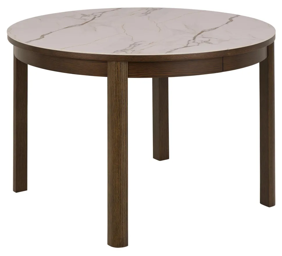 De diepe, rijke tint van het gerookte eikenfineer en het gepolijste crèmekleurige keramiek met subtiele aderen creëren een visuele sensatie die de zintuigen prikkelt. Ontworpen met een rond keramisch blad en stevige vierkante poten, zal deze eettafel de ruimte aanvullen met zijn verfijning. Hij biedt comfortabel plaats aan 4 personen en is voorbereid voor verlengbladen.