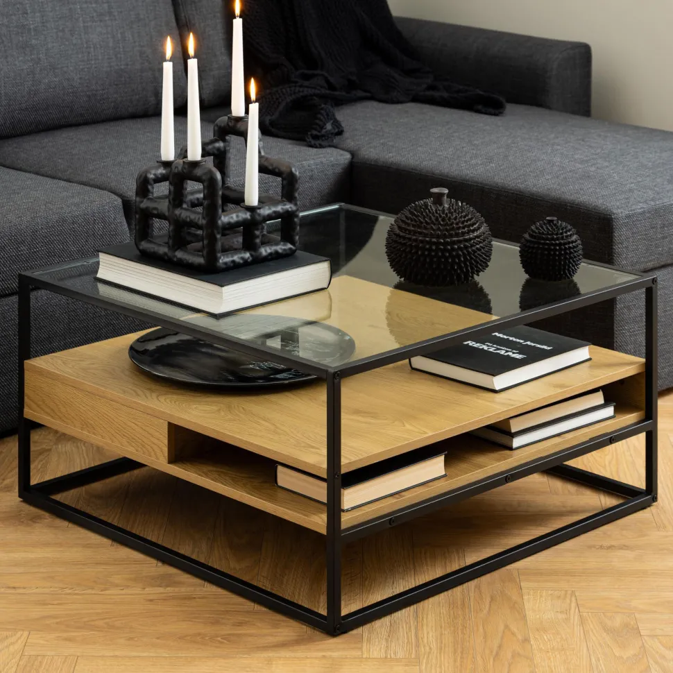 Met een karakteristiek kubusvormig metalen frame past deze salontafel in elk modern huis. Het blad van helder glas geeft het die lichte uitstraling. Met de 2 planken in een wilde eiken look biedt de tafel stijlvolle opbergruimte. Geniet van de moderne sfeer terwijl je koffie drinkt – of thee als je dat liever hebt.